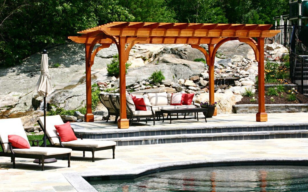This pergola structure provides a respite from the sun, while creating an architectural accent on a large expanse of patio by a pool.