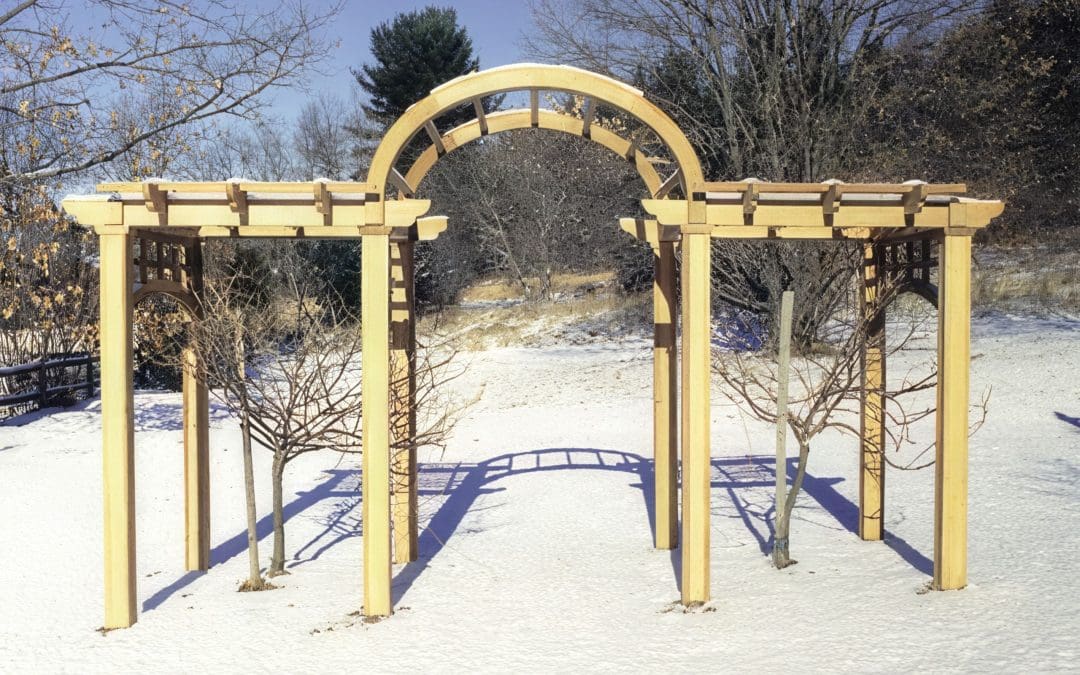 This attractive and sturdy garden structure was created for two wisteria vines positioned under either wing.